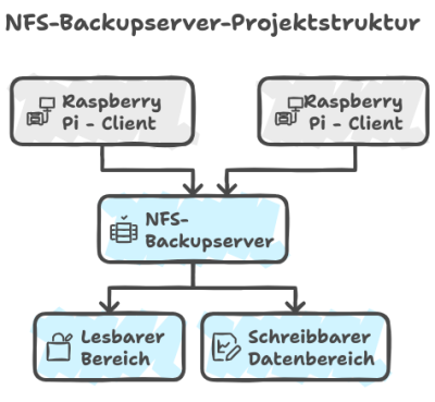 In diesem Projekt wird aus einem Raspberry Pi ein zentraler NFS-Backupserver für ein lokales Netzwerk aufgebaut. Ziel ist eine saubere und technisch nachvollziehbare Trennung zwischen einem ausschließlich lesbaren Bereich und einem schreibbaren Datenbereich.