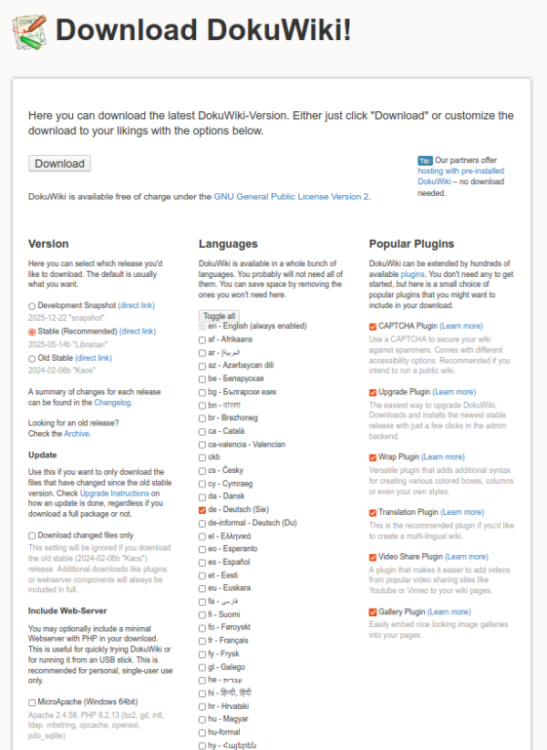 DokuWiki wird über die offizielle Website DokuWiki heruntergeladen.
