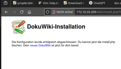 - Zum Schluss sind häufig Aufräumarbeiten durchzuführen. Bei DokuWiki bedeutet das, dass die Installationsdatei auf dem Server gelöscht werden muss.