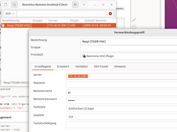 Remmina ist ein grafischer Remote-Desktop-Client für Linux, der unter anderem das VNC-Protokoll unterstützt. Zur Verbindung wird eine neue VNC-Verbindung angelegt und die IP-Adresse des Raspberry Pi sowie die entsprechende Display-Nummer (z. B. 192.168.1.50:1) eingetragen.