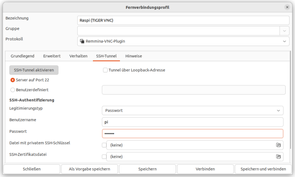 Da VNC-Verbindungen standardmäßig nicht verschlüsselt sind, empfiehlt sich bei Zugriffen über unsichere Netzwerke die Verwendung eines SSH-Tunnels.